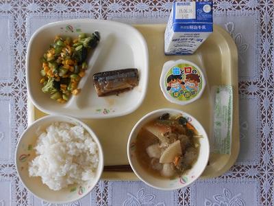 【給食メニュー】 さんま梅煮、きゅうりと枝豆のサラダ、根菜のごま汁、果物ゼリーです。
