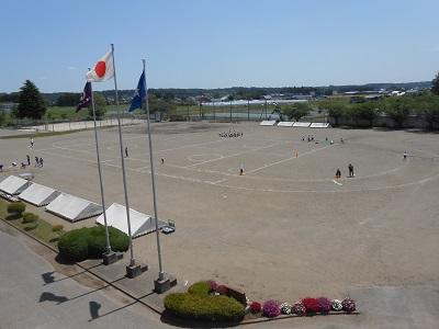 【朝の様子】 校庭は東小学校の運動会の跡が残っています。それらを活用し、本校の「体育祭」(6/8)の練習が本格的に始まります。
