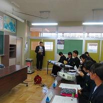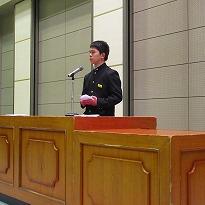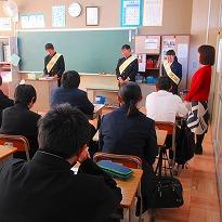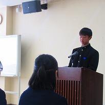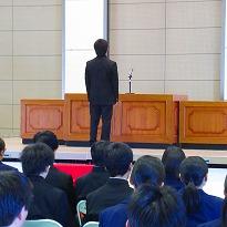 ●同窓会長の齋藤満則様にご来校をいただき、「ごあいさつ」と「記念品」を代表生徒(山本君)に授与していただきました。