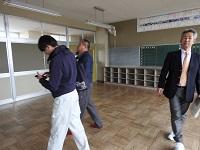 〇エアコン設置工事の現場確認・・・・・・今年度から継続で、町内小・中学校の普通教室に「エアコン」が設置されることになります。 現場確認のために、こどもみらい課の施設管理担当3名が来校し、校舎内の教室と室外機、設置場所の確認をしました。