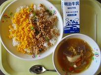 (今日の給食 混ぜご飯) (青空に国旗がたなびいています)