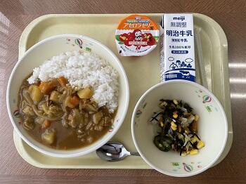 麦ごはん ホタテ入りカレー こんにゃく海藻サラダ アセロラゼリー