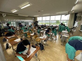 土曜日の決戦を控え、本日、生徒たちはひと時の休息をとっております。代わりに校庭では東小学校のかわいい児童が運動会の練習をしていました。写真は1校時目の授業風景です。