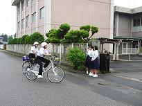 登校については、片側歩道の道路であり、「右側の歩道」を自転車が通行した方がより安全だと考えます。新道交法改正で、自転車は左側通行となっていますが、この県道の山道、坂道の登校時については、「右側の歩道」を一列で登校するよう、親からもお話ください。