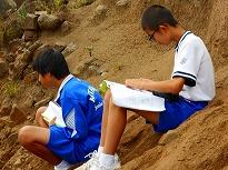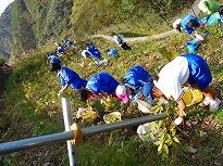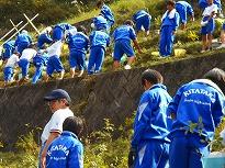 ●生徒たちは、ボランティアの方々の案内をいただきながら、植樹をする山に登り、斜面にスコップで穴を掘り苗木を植え付けました。