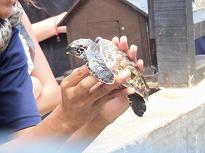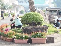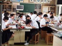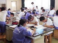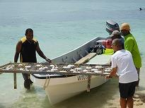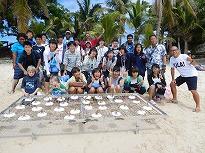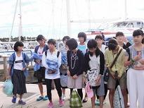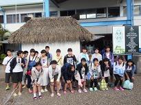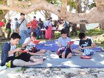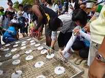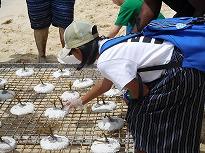 そして、もう一つの活動「珊瑚の移植」をしました。丸いビスケットというセメントの型に、切った珊瑚の先を生徒たち、そして周りにいた海水浴の子どもたちも参加して、移植をしました。 このビスケットは、海に6ヶ月置いて育て、大きくなった珊瑚は、海に定植するそうです。 「珊瑚が育つと、魚が住み着き、その魚を食べる大きな魚がやってくるそうです。」