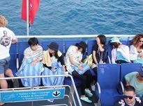 〇マナ島へ高速艇で・・・・・・10時30分、デナラウ・マリーナを大型高速艇でで出発しました。1時間30分の船旅です。 高速艇は満員で、日本人も数名、他は外国人のお客さんでいっぱいでした。 緑の海の色と市m島の緑の美しさは他では見られない光景でした。1名女子が、船酔い気味で寝ていました。
