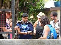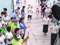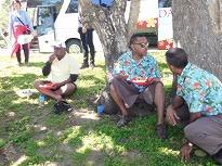 ガイドのジョーさんが、フィジー語で厳かにお土産の「カバ」を手渡しました。そのあと、村長から、長々とお言葉がありました。 団員生徒は、時折、手を打つ時、一緒に合わせて手ばたきをしました。残念ながら、「カバの儀式」はなく、そのまま砂浜の昼食会場に向かいました。******裏話ですが、中学生が訪問とあって、未成年の訪問者なのでカバは省略し、お昼のバーベキュー・パイティをしてくれたようです。
