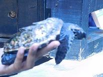 その後、浜辺に行き、保護したウミガメを私が代表で、海辺にリリース(放流)しました。このタグをつけたウミガメの名前は、「タロタロ」です。高根沢町のゆるキャラの名前をつけていただきました。 ウミガメは約100年生きるそうです。「タロタロ」の生体や動きをGPSで研究していくそうです。