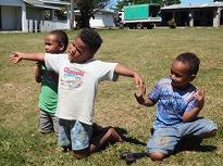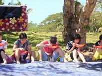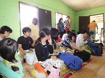交流学習では、サンベトの生徒が「ココナッツの葉を遣った工作やバック」を団員に教えてくださいました。 片言の日本語で、「蛇」や「ピロペラ」、「バック」などの作り方を教えてもらいました。 その後、団員が折り紙を教えたり、じゃんけんなどをして楽しみました。 11時40分頃、集会室で全員で、辛いフィジー風の2種類の「カレーライス」を食べて交流を深めることができました。