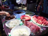〇ビーチには、村人の男女8名ぐらいが、ソーセージと鶏肉を鉄板で焼きバーベキュー・パイティを企画してくださいました。他に、日本のお米のご飯、タピオカ、スイカ、飲み物などを用意していただき、ビーチの木陰で、みんなでランチをしました。