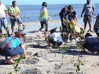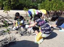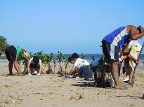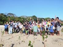 〇「マングローブ」の植樹・・・・・・OISCA職員と村の人たちと私たち高根沢の団員全員で、800本の「マングローブ」をコーラル・ビーチの一部の植樹しました。「何本、植えますか?」と聞くと、「800本です。」という回答でした。 1時間以上かかって、海風を受けながら、全員で800本の「マングローブ」を植えることができました。