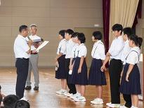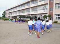 最初に、全児童生徒が校門で、私たちを歌で迎えてくれました。