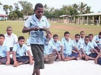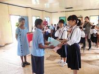 8月23日には、現地の学校へ行きました。フィジーの生徒は、ココナッツの葉で風車やバッグを作ってくれました。お返しに私たちは、折り紙や剣玉など、日本の文化を教えました。