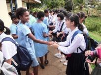 交流活動では、団員は「よさこいソーラン」を踊りました。日本の踊りを興味深くサンベトの生徒は見ていました。 お返しに、「5人の男踊り」と「女子1名(担任の先生の娘さん)がフィジーの踊り」を披露してくださいました。