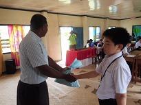 その後、着席し「カバ」を学校長に贈呈。その返礼に「カバの儀式」を行いました。この儀式は、フィジーでは通例の客を招待する儀式だそうです。 私とさんベストの校長と代表生徒1名が、「カバ」(カバの根から作った茶色のお茶のような飲み物)を飲み、儀式は終了しました。