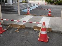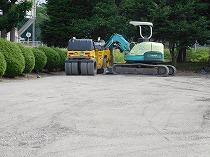 〇体育館南側が職員駐車場に・・・・・・「体育祭」後、東小新築工事ともないコミセン駐車場が使用できなくなります。そこで、職員駐車場を体育館南側、テニスコートとの間の芝生の部分に砂利を入れ整地しています。