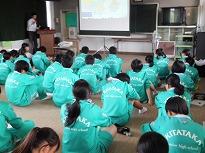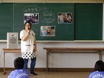 〇食指導・・・・・・今日の給食時、町学校給食センター栄養教諭の水井 浩子先生が来校し1年1組で「食に関する講話」をしていただきました。