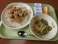 <校長室コラム2「食育 校長会食1年3組へ」> 今日のメニューは、中華丼、牛乳、春雨サラダ、オレンジでした。 お皿にご飯をのせ、中華丼の具をその上にのせていただきました。