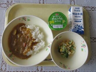 今日の給食は、ご飯、牛乳、チキンカレー、コーンサラダ、ヨーグルトです。高根沢町で生産されたものは、玉ねぎ、米です。今日もたいへんおいしく頂きました。