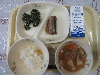今日の給食は、栗ご飯、ごま塩、牛乳、さんま梅煮、ツナのり酢和え、けんちん汁です。高根沢町で生産されたものは、味噌、大根、ねぎ、米です。2日ぶりの給食、たいへんおいしく頂きました。