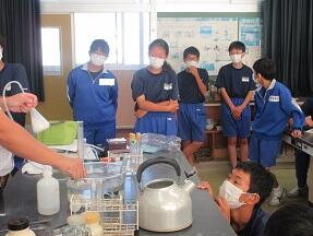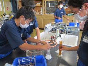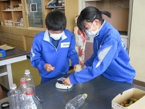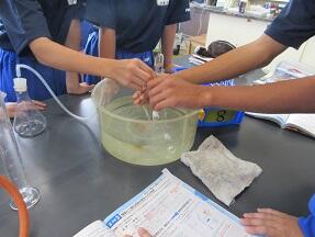 酸素と二酸化炭素を発生させる実験で、教員の演示実験を見ながら、前の時間上手くいかなかった原因を見つけ出していました。