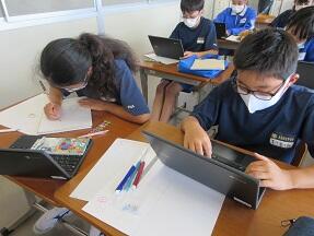 空想画で自分のイメージに合った着色を探す活動が展開されていました。