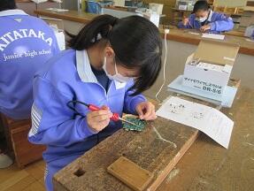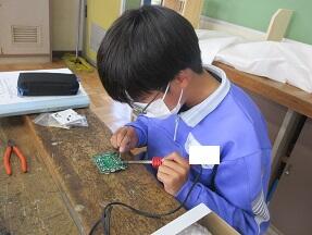ワイヤレスラジオづくりで、固定抵抗器をはんだ付けしていました。着々と完成に向かって進んでいます。