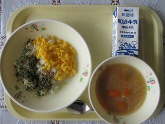 今日の給食(7月15日) 投稿日時 : 2021/07/15 北高根沢中学校管理者 カテゴリ: ~今日の給食(7月15日)~ 今日の給食は、二色丼(麦ご飯、ふりかけ、卵そぼろ)、牛乳、豆乳仕立ての野菜汁です。高根沢町で生産された物は味噌、豆乳、にんじん、ねぎ、米です。今日もたいへんおいしく頂きました。