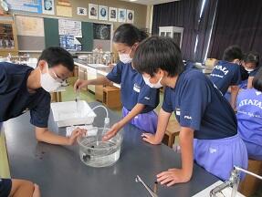 二酸化マンガンと過酸化水素水を使って酸素を発生させ、その性質を調べる学習が展開されていました。生徒たちは意実験に実験に取り組んでいました。