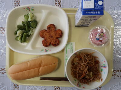 【給食メニュー】焼きそばパン、牛乳、花型豆腐ハンバーグ、グリーンサラダ、三色ゼリーです。三色ゼリーは白色が雲、緑色が若草、ピンクが桃の花を表し、寒い冬が去って暖かな春が来ることを願っているそうです。ごちそうさまでした。