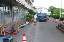 〇玄関、職員室前が排水工事に・・・・・・今週から校舎前のアスファルト部分を掘削し、排水のために塩ビ管を埋める工事が始まりました。