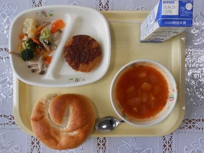 【給食メニュー】 米粉パン、キャベツメンチカツ、ブロッコリーとしめじのサラダ、ミネストローネです。米粉パンは柔らかくてもちもちしていました。
