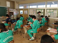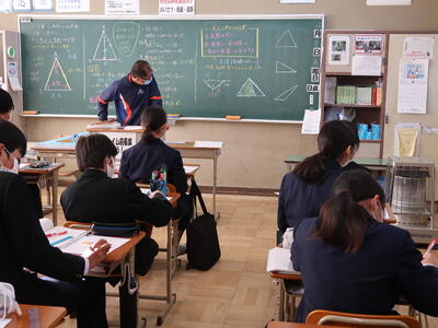 1年2組「家庭」布を使って雑巾を完成させていました。細かい間隔で仕上げていた生徒もいました。