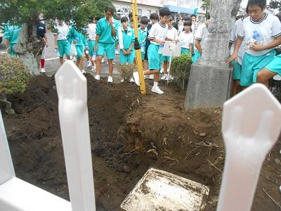 本日、保護者の御協力により「町制30周年記念のタイムカプセル」を掘り起こしました。以前、本校職員で掘り起こしに挑戦いたしましたが残念ながら掘り起こすことが出来ませんでした。