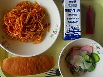 (今日の給食 ツナ入りナポリタン) (朝、5名が国旗掲揚していました)