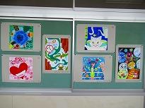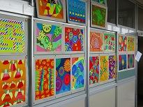 (1年生教室廊下の掲示 下野美術展に出品した作品を掲示しています)