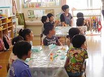 〇にじいろ保育園訪問・・・・・・今日の③、④校時の2時間、2年1組は家庭科の単元の学習で、にじいろ保育園に訪問しました。 生徒たちが、年長、年中、年小の組に入り、園児たちと切り紙の手伝いや生活指導の手伝い、水遊び(水泳)の補助、着替えの手伝いなどをしました。