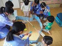 【保育園訪問】家庭科の授業で「保育」を学びます。2年3組が「にじいろ保育園」に訪問し、自分たちで作った遊び道具で園児と一緒に楽しい時間を過ごしました。