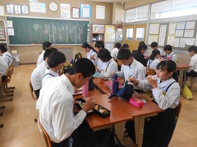 【お弁当】いつもの給食とは違い、一人一人が違ったメニューで、美味しそうに嬉しそうにお弁当を食べていました。生徒の中には全部自分で作った人や詰めることだけやった人など様々でしたが、とても素晴らしいのは、だれ一人忘れなかったことです。これもひとえに保護者の皆様の御協力のおかげです。改めて感謝申し上げます。