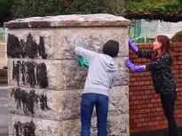 また、総務委員さんには、校門の「黒カビ取り」をお願いしました。 洗剤を使い亀の子タワシで磨くことで、「黒カビ」が落ちて白い石(元の姿)が表れました。