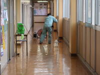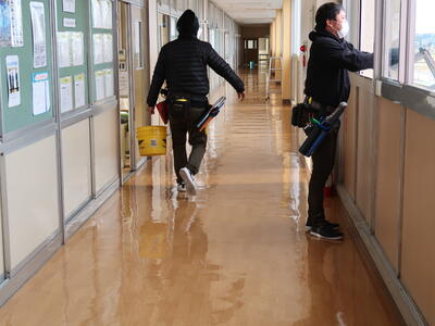 【環境整備】現在、業者の方に依頼して、廊下・体育館のワックス塗りと窓ガラス清掃を行っています。8日からの登校できれいな廊下を体感してください。顔が写るかもしれません。