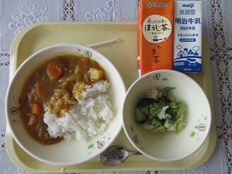 今日の給食は、みんなが食べられる食材を選び、考えた給食です。ご飯、ハートカレー、花野菜とハートのパスタのサラダ、牛乳(ほうじ茶)です。高根沢町で生産された物は、アスパラガス、じゃがいも、米です。今日もたいへんおいしく頂きました。このハートカレーを食べるたびに、ご苦労なされている栄養教諭さん、栄養士さん、調理員さんたちそしてそれ以外に関わっている関係者の方々に感謝の気持ちを強く感じます。