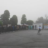 ●登校時、男子ソフトテニス部が「霧」の中でも、登校してくる生徒たちに大きな声であいさつしていました。