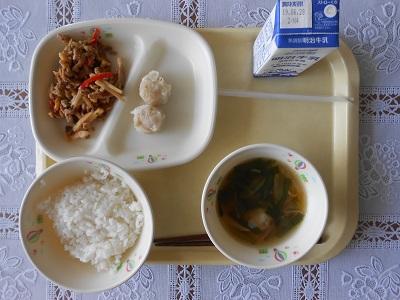 【給食メニュー】 エビ焼売、青椒肉絲、ワンタンスープです。中華料理のメニューでした。