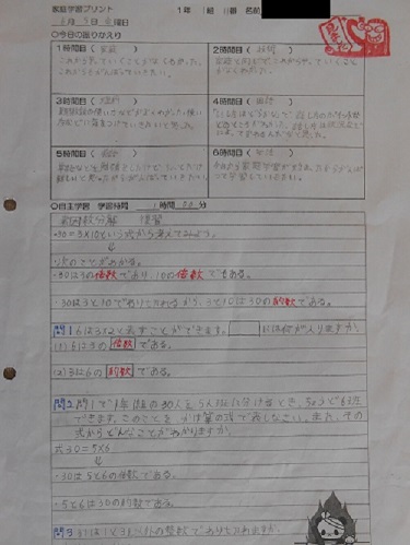 【家庭学習】1年生では家庭学習の充実を図るために「家庭学習プリント」を実施しています。学校で学んだ内容の復習や次に学ぶ内容など各自違いはありますが、熱心に取り組んでいるようです。「継続は力なり」といいます。1年生頑張れ!