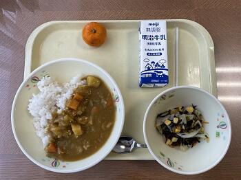 麦ごはん チキンカレー こんにゃく海藻サラダ 冷凍みかん