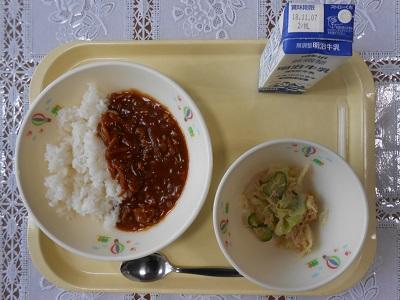 【給食メニュー】 ハッシュドポークとツナサラダです。じっくりと煮込んで濃厚なポークカレーでした。