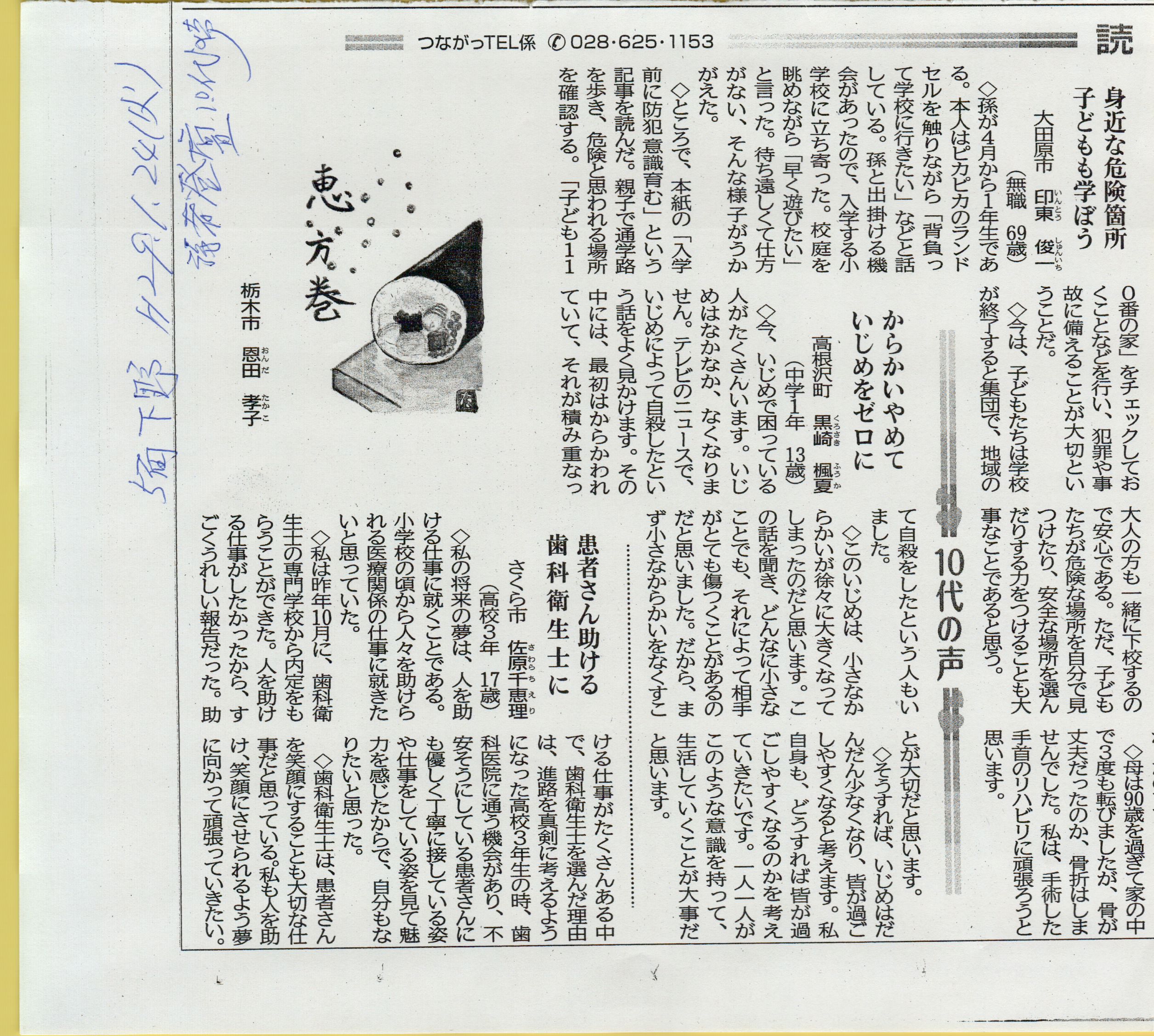 〇下野登壇 10代の声に・・・・・・1月24日付け「下野新聞」5面に、北中1年 黒崎さんの作文が掲載されました。