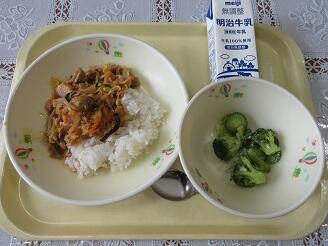 今日の給食は、プルコギ風豚丼(麦ご飯・プルコギ風豚丼の具)、牛乳、グリーンサラダです。高根沢町で生産された物は、アスパラガス、にんじん、玉ねぎ、椎茸、キュウリ、キャベツ、米です。今日もたいへんおいしく頂きました。